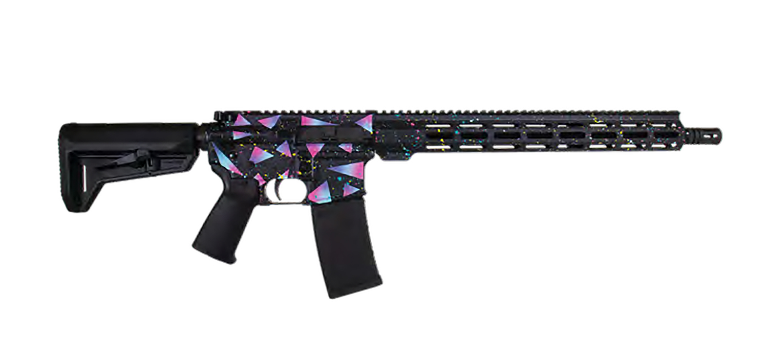 The Miami AR is a striking and vibrant firearm that stands out with its bold blue and magenta triangles and multi-colored paint splotches. The black Cerakote finish provides a sleek and modern base for the playful and eye-catching design. The Miami AR is built with quality craftsmanship and precision components, ensuring its reliability and accuracy.